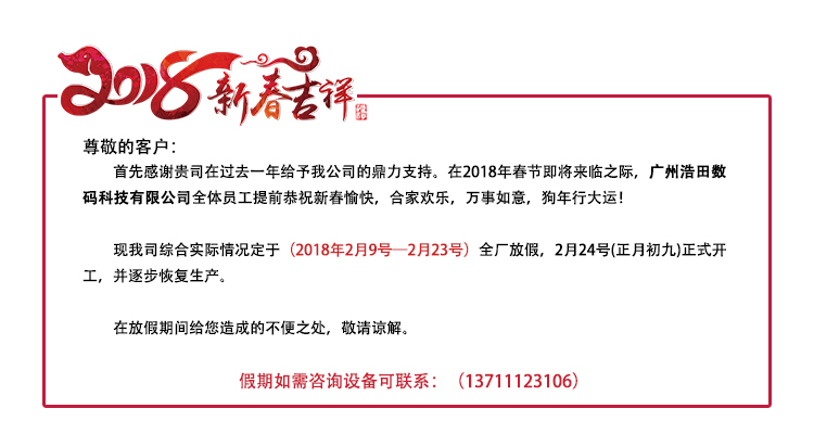 首先感謝貴司在過去一年給予我公司的鼎力支持。在2018年春節(jié)即將來臨之際,廣州浩田數(shù)碼科技有限公司全體員工提前恭祝新春愉快,合家歡樂,萬事如意,狗年行大運(yùn)! 現(xiàn)我司綜合實(shí)際情況定于2018年2月9號(十二月二十三)至2月23號(正月初八)全廠放假,2月24號(正月初九)正式開工,并逐步恢復(fù)生產(chǎn)。