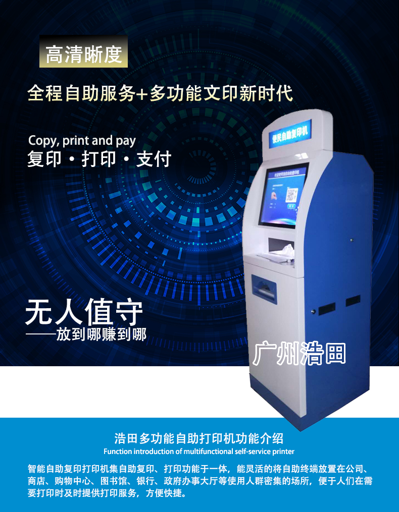 浩田自助打印機怎么使用?它真正實現了無人化管理,實使用校園卡/投幣/微信掃碼支付即可完成復印文件支付,宿舍大樓自助打印機打破了傳統復印店的壟斷,受到師生們的歡迎。