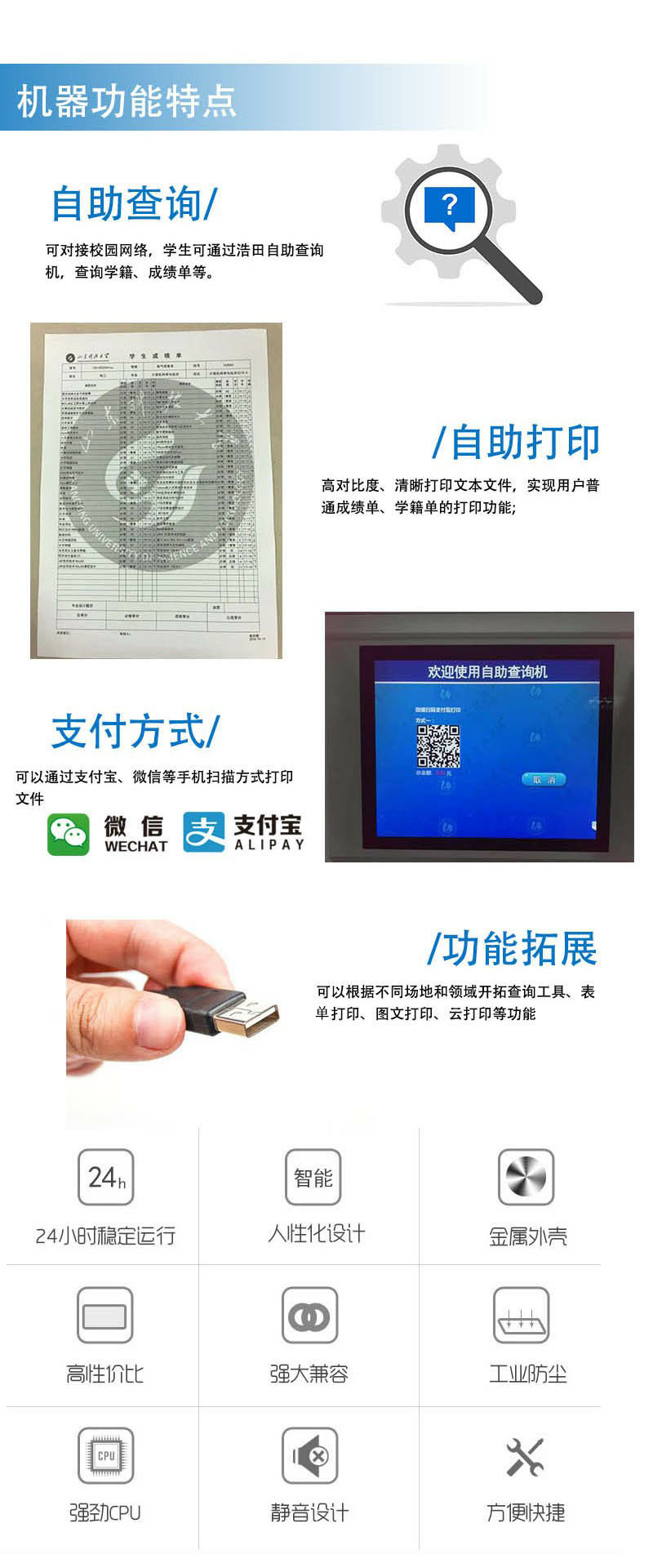學院的辦學規模還在逐年擴大,專業還在不斷分化,學生人數還在迅速增加。打印量需求會不斷增大。而且在高等教育大眾化的大背景下,。這些變化使得學院教務管理部門的任務越來越重,不僅增大了工作量,更是增大了工作難度。浩田自助查詢打印機就是通過自助打印服務軟件平臺,統一管理學生成績單、學籍等資料的自助打印系統設備。