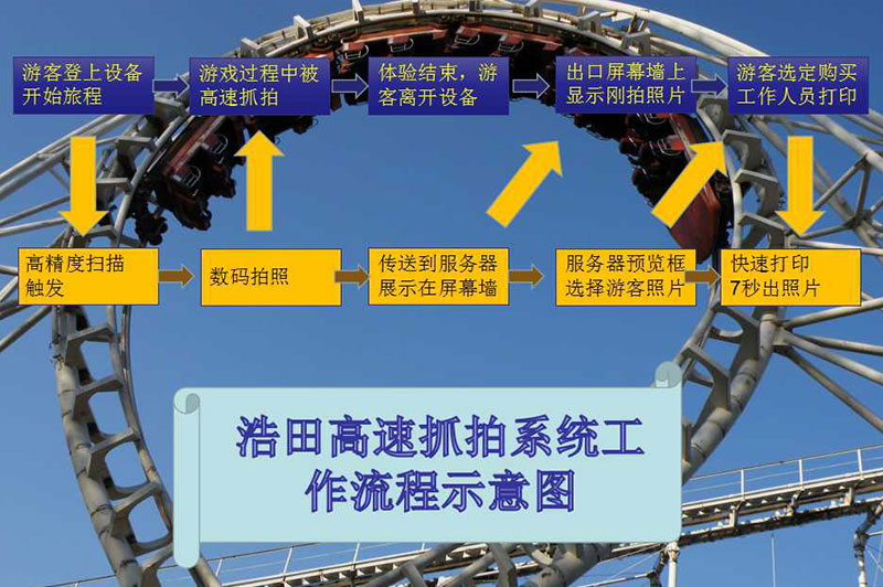 自動檢測 → 觸發(fā)并拍攝 → 自動傳輸→ 終端自動讀取照片信息→屏幕顯示→游客下車后瀏覽照片 → 游客做出選擇 → 自動打印 → 領取包裝照片