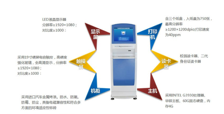 硬件部分包括智能化機柜、觸摸屏、電腦主機、投幣器、錢箱、打印機、支付組件、數據庫服務器,此外還可以選擇添加一卡通讀卡器、身份證讀卡器等設備。